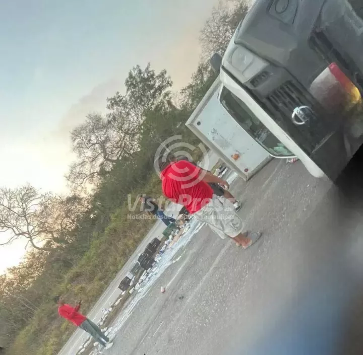 Pueblo Viejo, Ver.-Una camioneta cargada con productos lácteos volcó la mañana de este miércoles en la carretera Tuxpan–Tampico, a la altura del puente Los Soldados, luego de que le estallara un neumático.