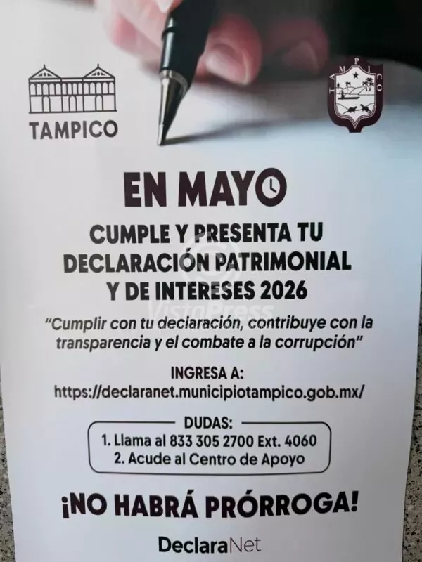 Tampico, TAM.- Durante el mes de mayo, todos los servidores públicos del Ayuntamiento de Tampico deberán cumplir con la presentación de su Declaración Patrimonial y de Intereses 2026, como parte de las obligaciones en materia de transparencia y rendición de cuentas.