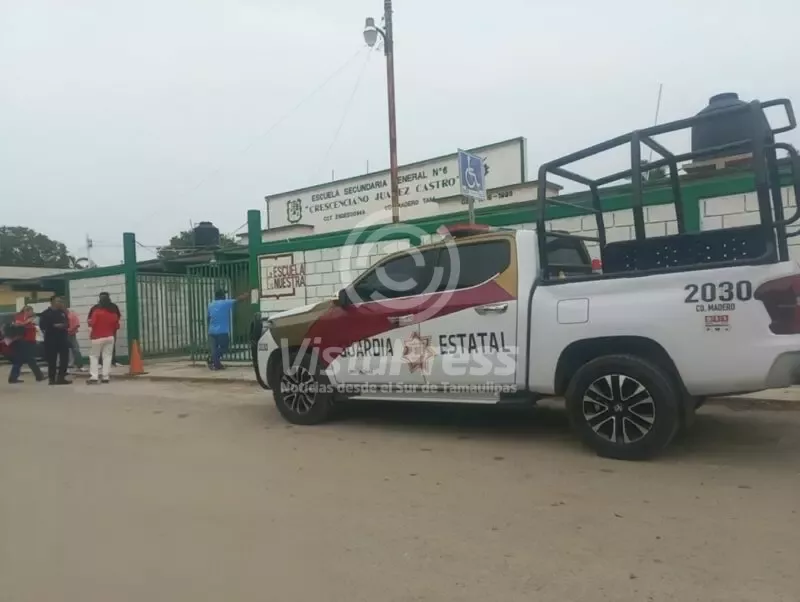 Uno de los planteles intervenidos fue la Secundaria General Número Seis “Prof. Crescenciano Juárez Castro”, en Ciudad Madero, donde elementos estatales, en coordinación con autoridades escolares, realizaron la revisión de mochilas de estudiantes para descartar la presencia de objetos no permitidos.