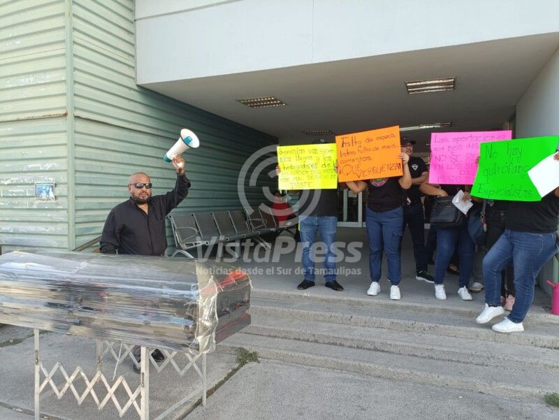 Maestros se manifiestan a las afueras de la clínica del ISSSTE en Matamoros: llevan ataúd