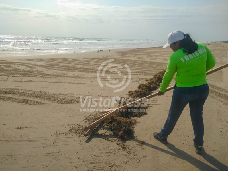 Municipio de Madero brinda intensa limpieza por sargazo en playa Miramar.