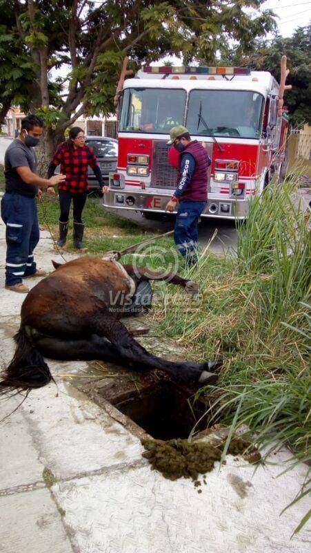 Rescatan Bomberos a caballo que cayó a alcantarilla