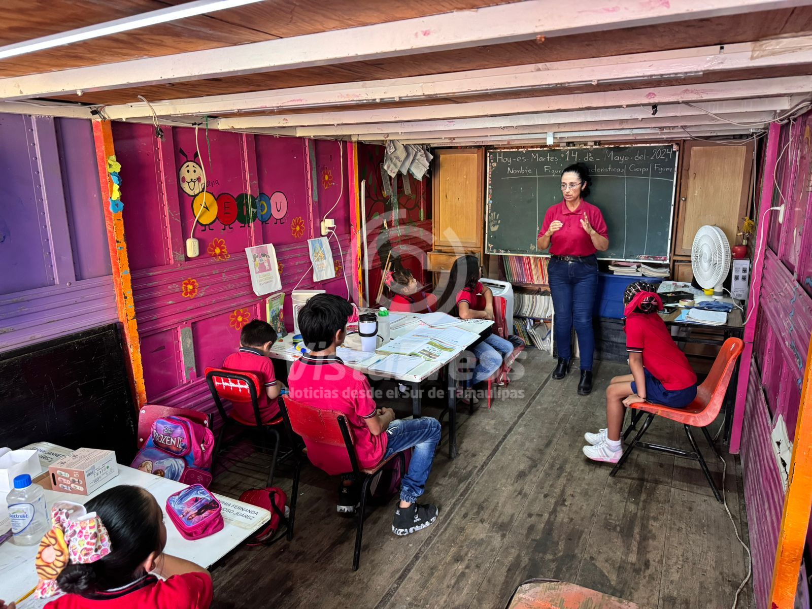 Abordo de una caja de tráiler que fue adaptada con un pizarrón, mesas y material didáctico, ocho hijos e hijas…