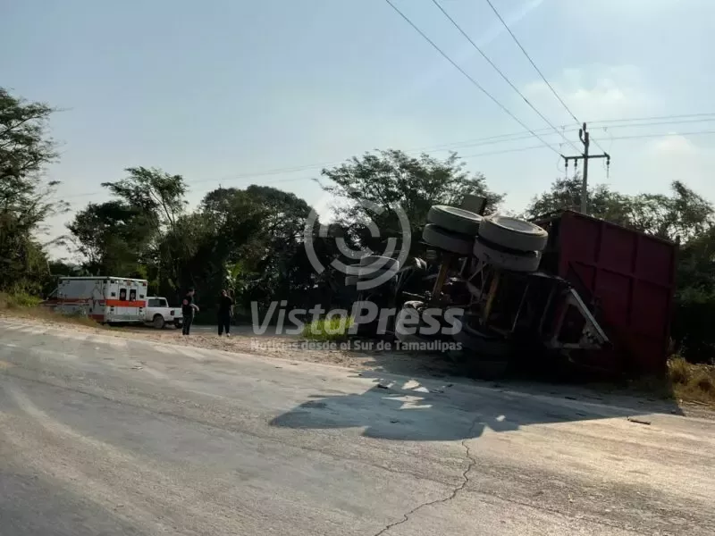 Tamuin, S.L.P.-Volcadura de un remolque con caña. En la entrada a la puntilla sobre la carretera federal 70 Valles -…