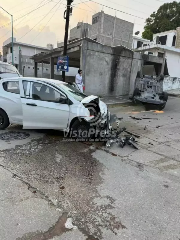 Aparatoso choque y volcadura deja tres estudiantes lesionados en Tampico