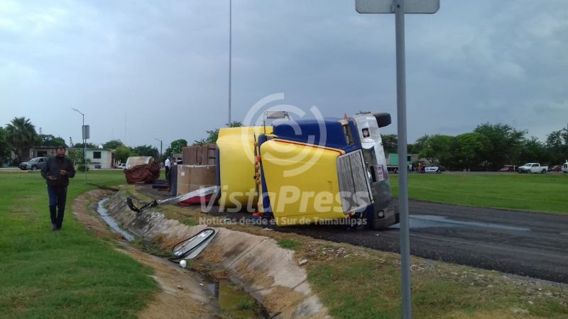 Tampico, Tam.- Un tráiler con doble remolque que pretendía incorporarse al Libramiento Poniente volcó justo frente al Faro de la…