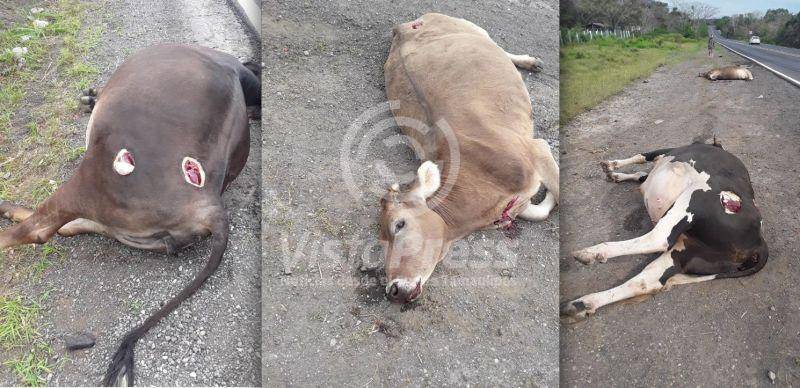 Tampico Alto, Ver.-Cuatro vacas que vagaban sobre la carretera federal Matamoros Puerto Juárez protagonizaron aparatoso percance, al ser impactadas por…