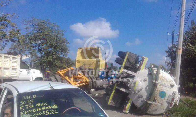 Pipa cargada con diésel choca por alcance a tractocamión y termina por volcar