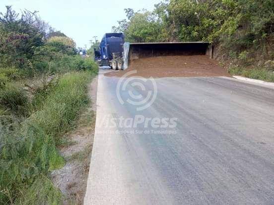 Se vuelca en curva de la muerte tráiler cargado de arena