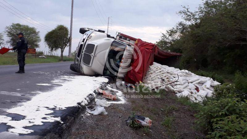 Tempoal, Ver.-El dormitar al volante y el pésimo estado de cartera provocó la volcadura de un tráiler que transportaba costales…