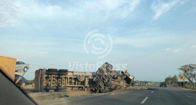 Vuelca tráiler cargado con coque frente a Villa Cuauhtémoc