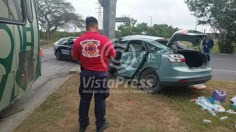 Brutal choque entre autobús y automóvil deja dos jóvenes lesionados