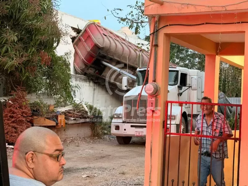 Caja de tráiler cargado con toneladas de grava se ladea y embiste vivienda en Ciudad Madero