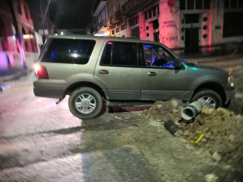 Se le acaba la calle y cae con su troca a una zanja en el centro de Tampico