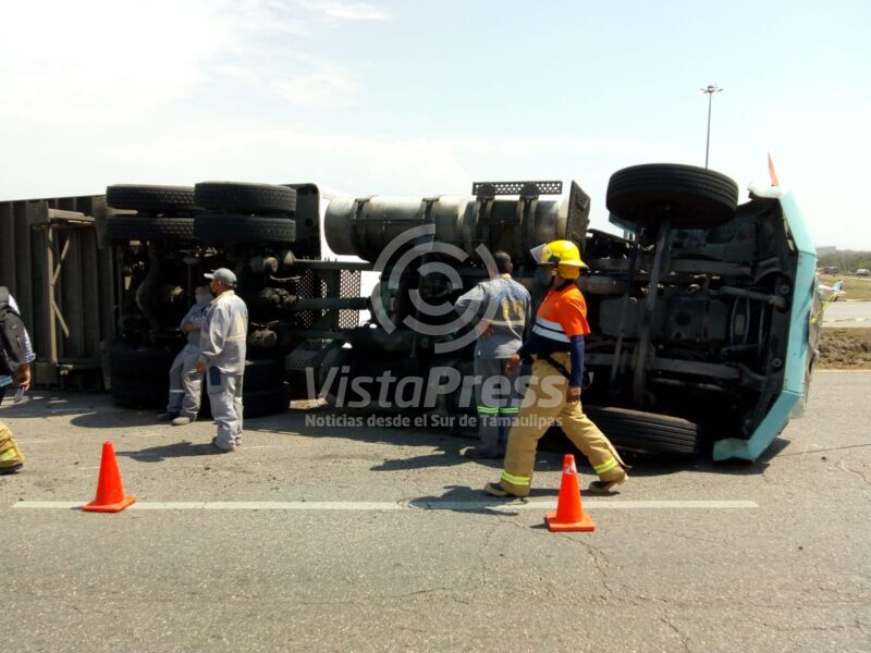 Altamira, Tam. Un tráiler cargado con costales de polietileno terminó por volcar en una curva pronunciada de un puente a…
