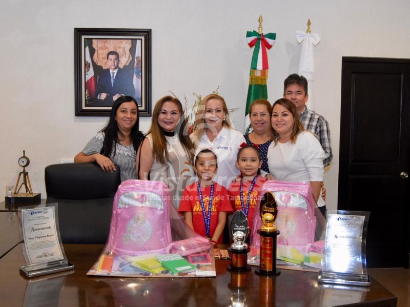 La presidenta municipal Alma Laura Amparán Cruz entregó reconocimientos a las alumnas de primaria Zury Tlapanco Reyes y Danna Geraldine…