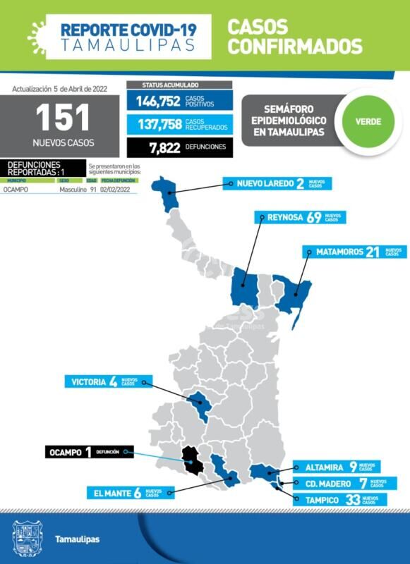Ciudad Victoria, Tamaulipas.- Tamaulipas cerró la jornada de este martes con un fallecimiento por COVID-19 y 151 nuevos casos, señaló…