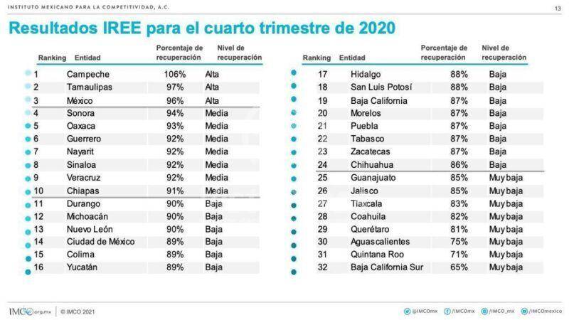 La entidad alcanzó el segundo lugar en el índice de recuperación económica estatal (IREE), elaborado por el Instituto Mexicano para…