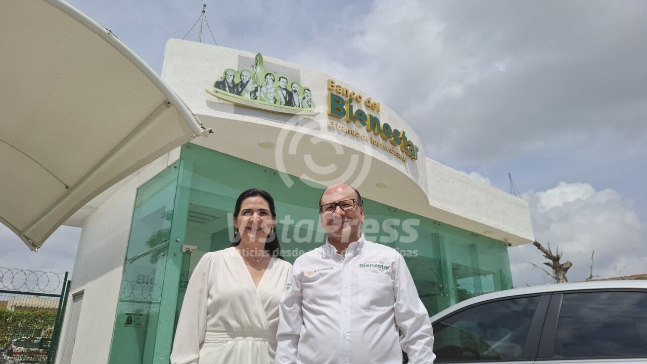 Mónica Villarreal Anaya y Juan Manuel Lamoyi verifican el funcionamiento de los Bancos de Bienestar