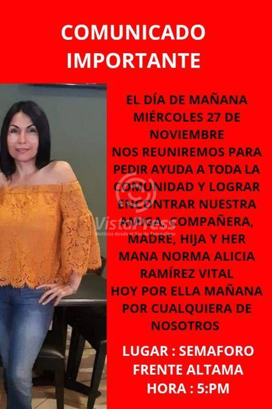 Tampico.- Familiares y amigos de Norma Alicia Ramírez Vital, quien no es localizada desde el pasado sábado, saldrán este miércoles…