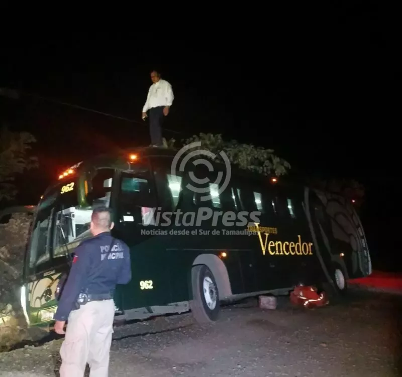 Autobús de pasajeros termina fuera de la carpeta de rodamiento