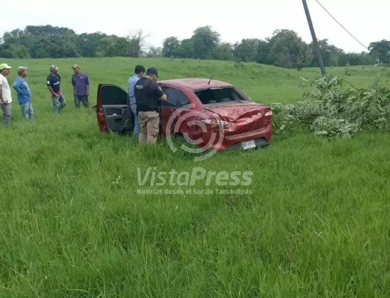 Pésimo estado de la carretera provoca la volcadura de un vehículo compacto