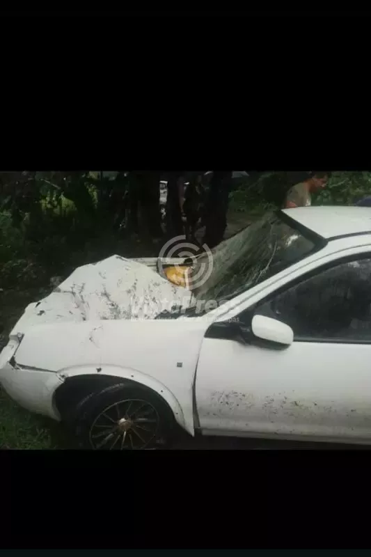 Cae enorme piedra sobre cofre de un carro en movimiento