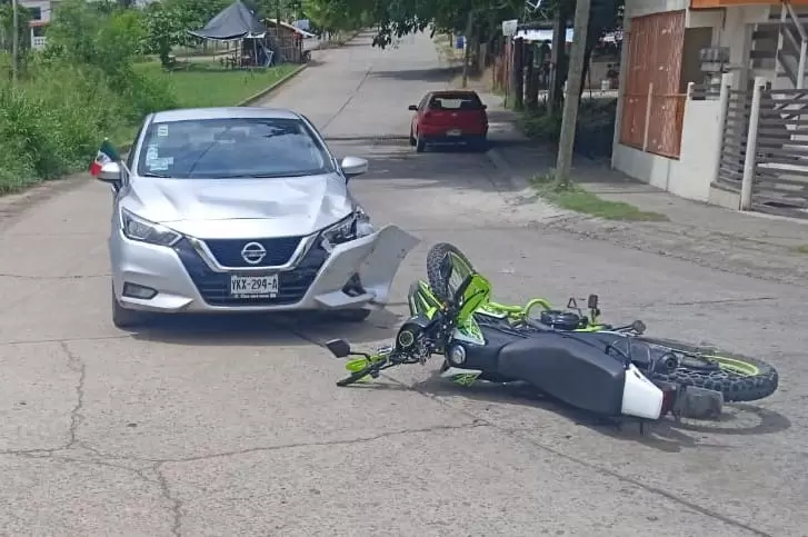 Dos lesionados deja colisión entre motocicleta y auto compacto